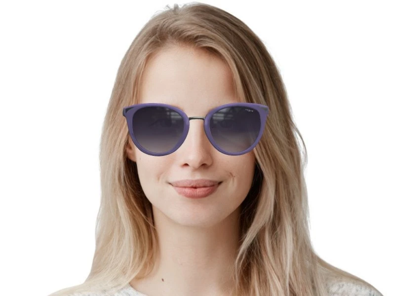 Gesichtsformen. Die Rahmenfarbe ist Violett und passt perfekt zu grünen Augen